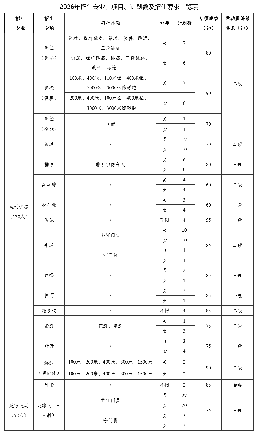 根据《2026年普通高等学校运动训练、武术与民族传统体育专业招生管理办法》(体科字〔2025〕171号)文件精神和要求,结合学校实际,特制定本简章。